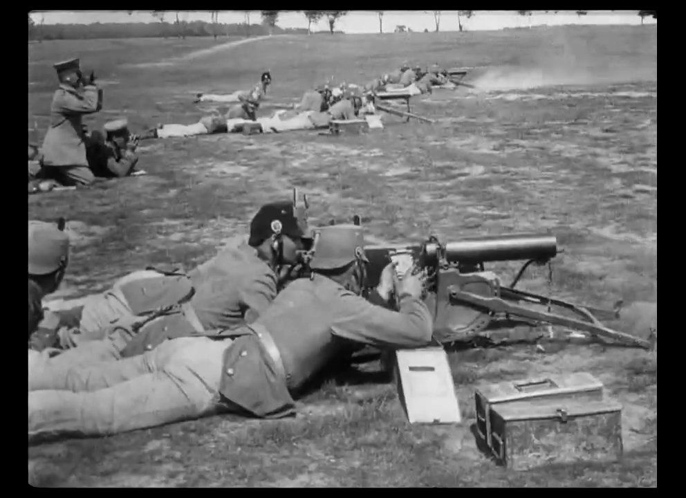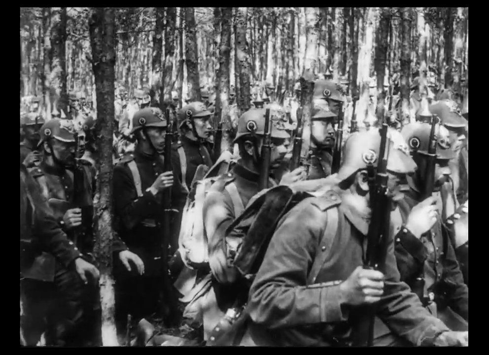 Ja, er gibt an, dass er vom deutschen Militär zensiert wurde, manche Einstellungen wirken, als wären sie auf provisorischen Truppenübungsplätzen im Hinterland der Front gedreht worden und vor allem, die Westfront wird absolut ignoriert und die Lusitania, die während der Entstehungszeit dieses Filmes versenkt wurde, spielt absolut keine Rolle. Entsprechen wirkt das Bildmaterial aus den Kampfgebieten ungewohnt, man sieht zwar auch Stacheldrahtverhaue von überwundenen Feldbefestigungen und Truppen biwakieren in Wäldern aber der Schützengraben ist noch kein „Wohnzimmer“ von dem man über Monate mit dem Nachbarn Geschosse austauscht. Irgendwie wirkt das ganze noch ähnlich dem, was man sich in dem Vorkriegsfilm Verflucht sei der Krieg vorgestellt hat. An der Ostfront war der Krieg viel mobiler als im Westen, entsprechen ziehen hier noch Ulanen in den eroberten Städten ein, die gegen Maschinengewehre eingesetzt, von diesen in kürzester Zeit niedergemäht worden wären.